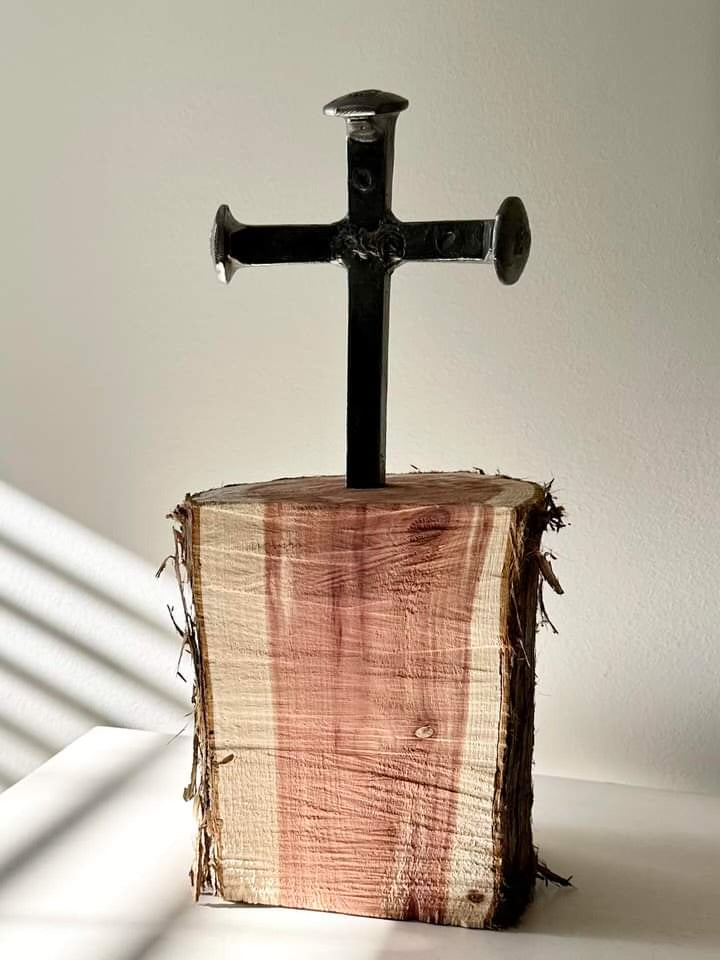 The mantelpiece is meticulously welded together using repurposed railroad spikes. The end reveal is an organic and beautiful rustic design for home or office.